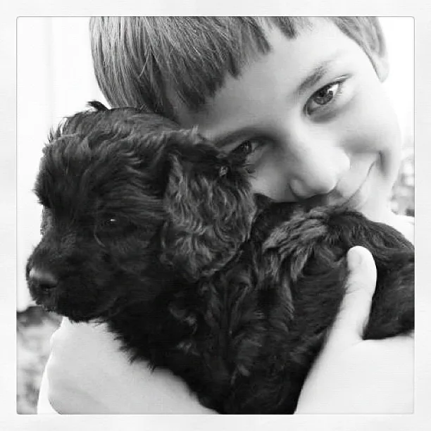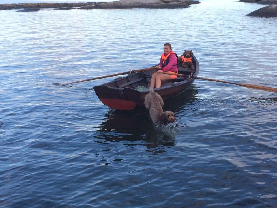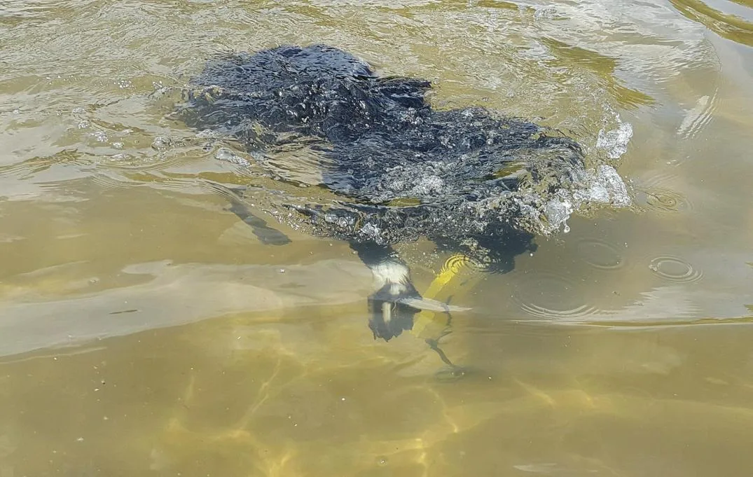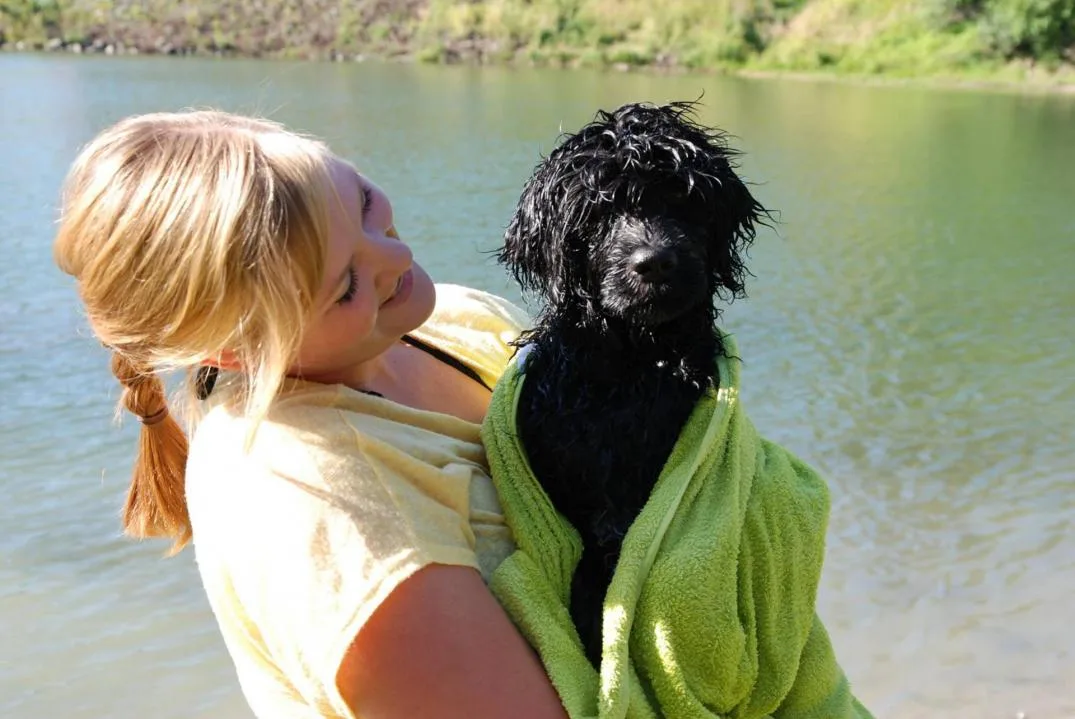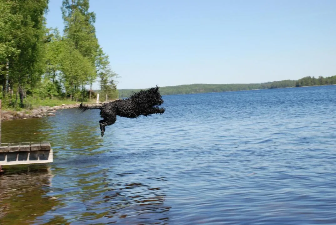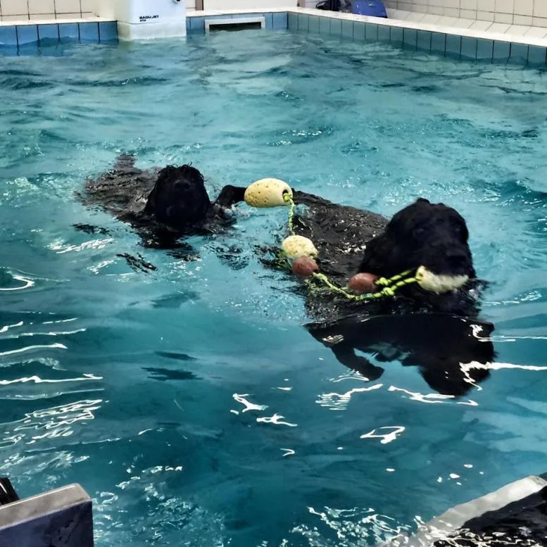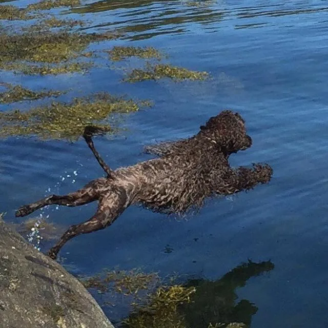 Vannbilde fra bassenget med Miro og valp