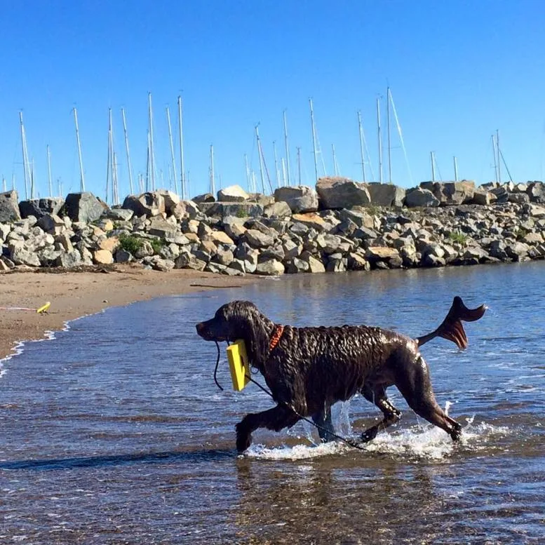 Vannbilde hund drar med apport på land